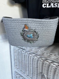 Braided basket embroidered bird on a nest